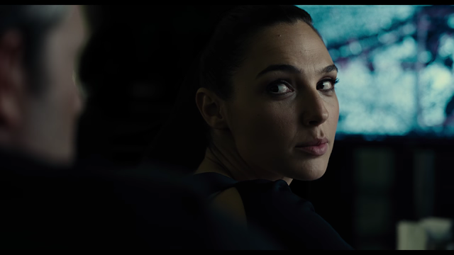 An awesome shot of Wonder Woman.It looks like she is at that place that we see on the thumbnail of the trailer.He shield does look as tough it has been hit with some laser as it does have some glowing red on it.The reason why Diana may not be fighting this thing is that it could be Superman brought back and he is evil, however, Diana does know this and just thinks it is Superman.It seems as tough she doesn't have a suit change.